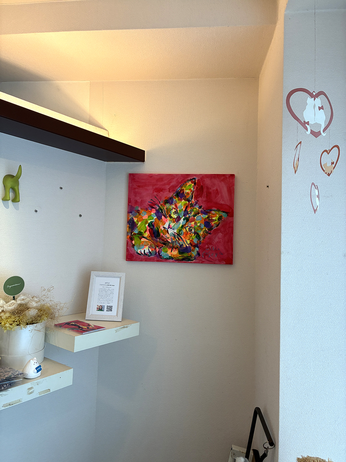 ファイヤーキングカフェのご近所にある動物病院 Cafelier↗︎ の充子さんが、入り口に飾っていた猫(タイトルは『負けん気』)を購入してくれたので、展示中だけど、ファイヤーキングカフェの絵を変えて、お届け。