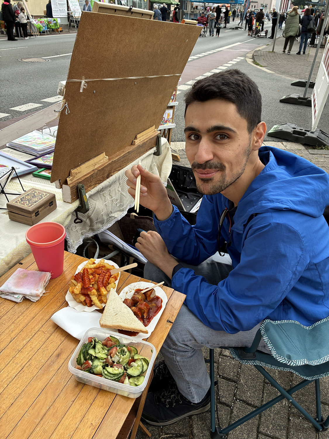 お隣で売っていた ウィンナーとポテトを買って、オパサラダとランチ♪