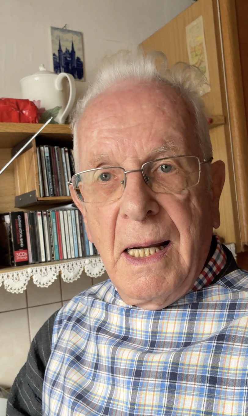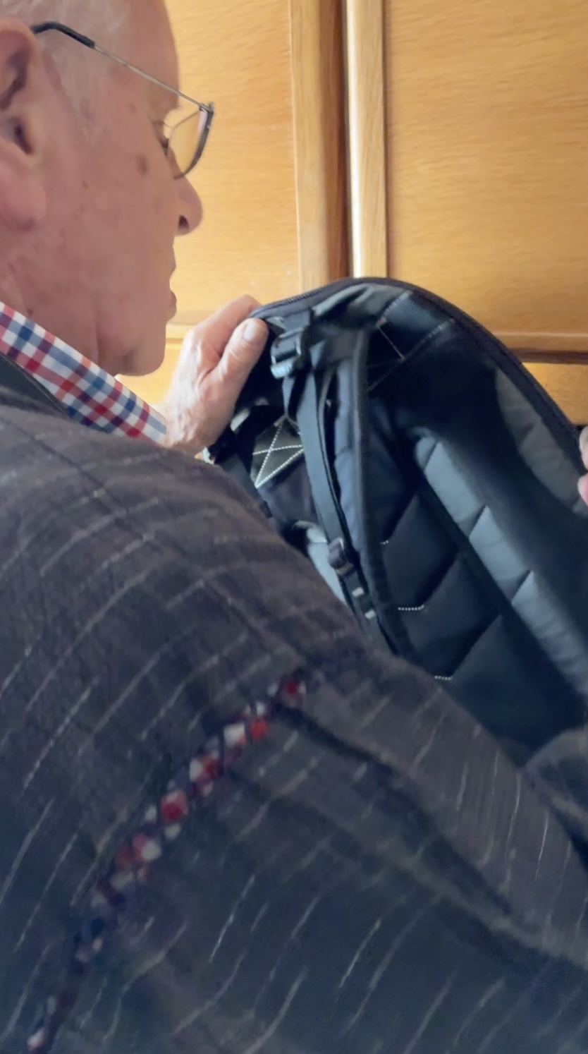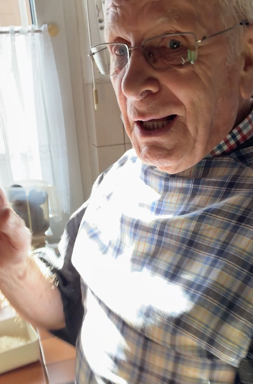 買い物帰り。前にあげた甚平を日常遣いでシャツに合わせるオパ。