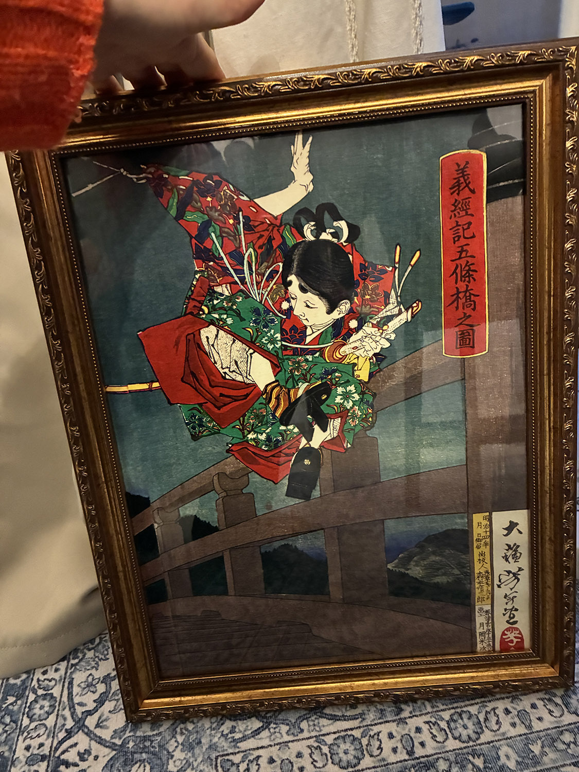 牛若丸(義経)と僧兵・武蔵坊弁慶が初めて出会い、戦って主従となるという「義経記 五条橋」の絵の一部。洋風な額に入れられて、洒落て見えます。そんなものがヨーロッパでは売られているのね〜と新鮮な気持ちに♪