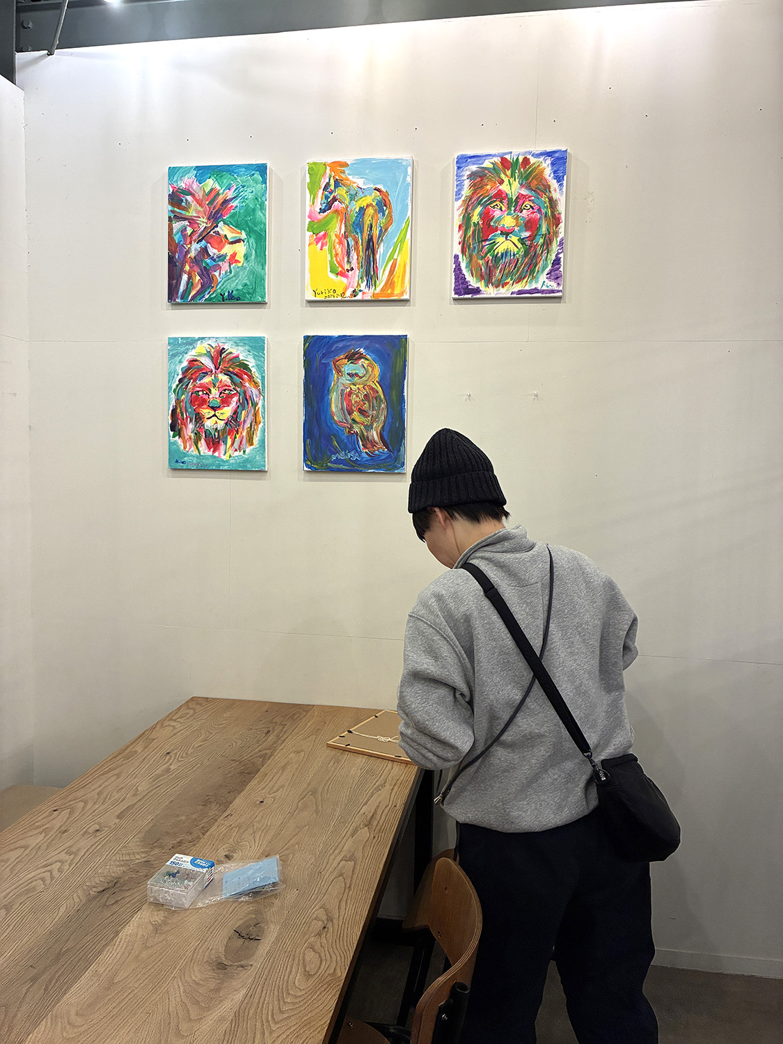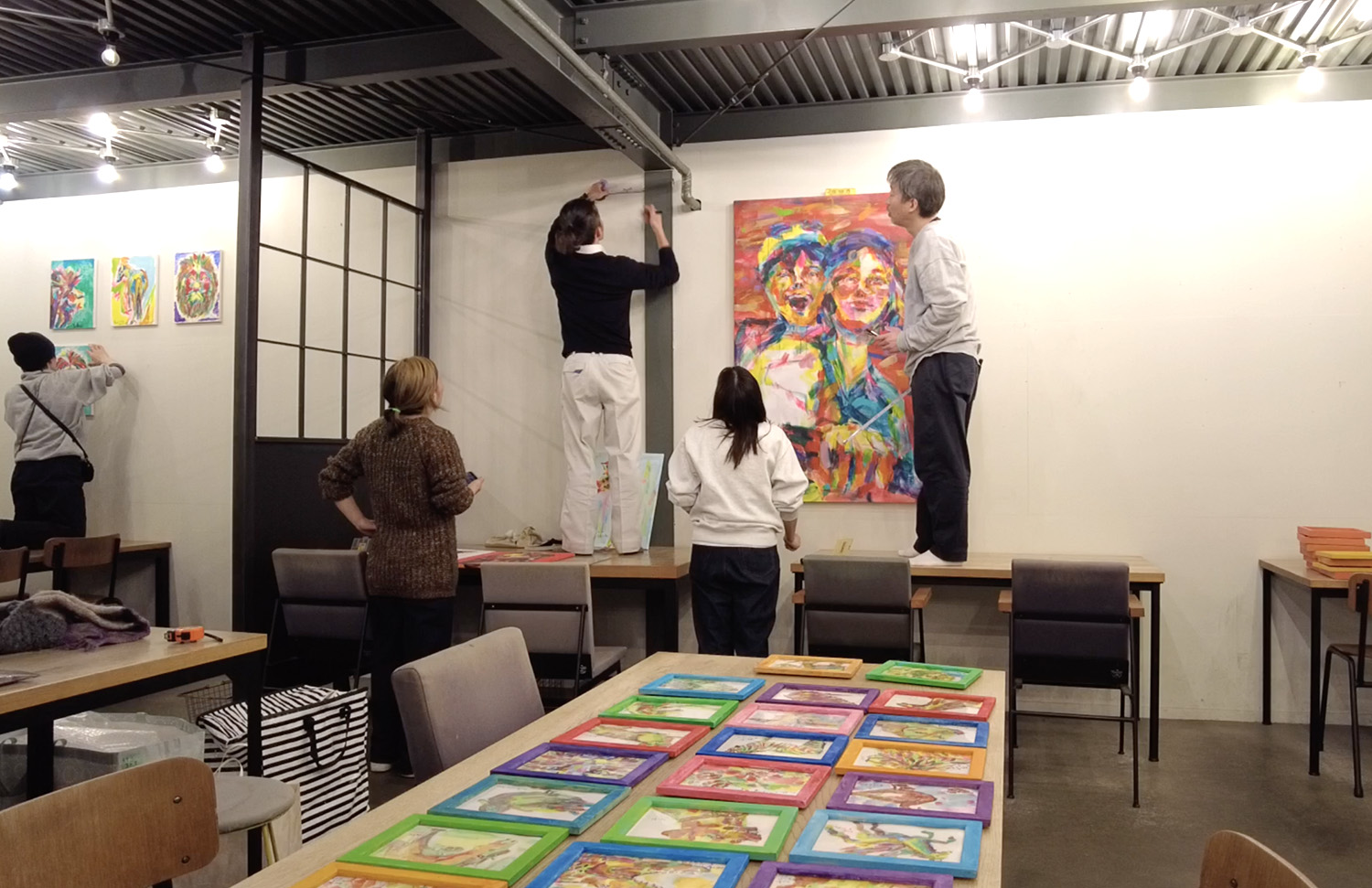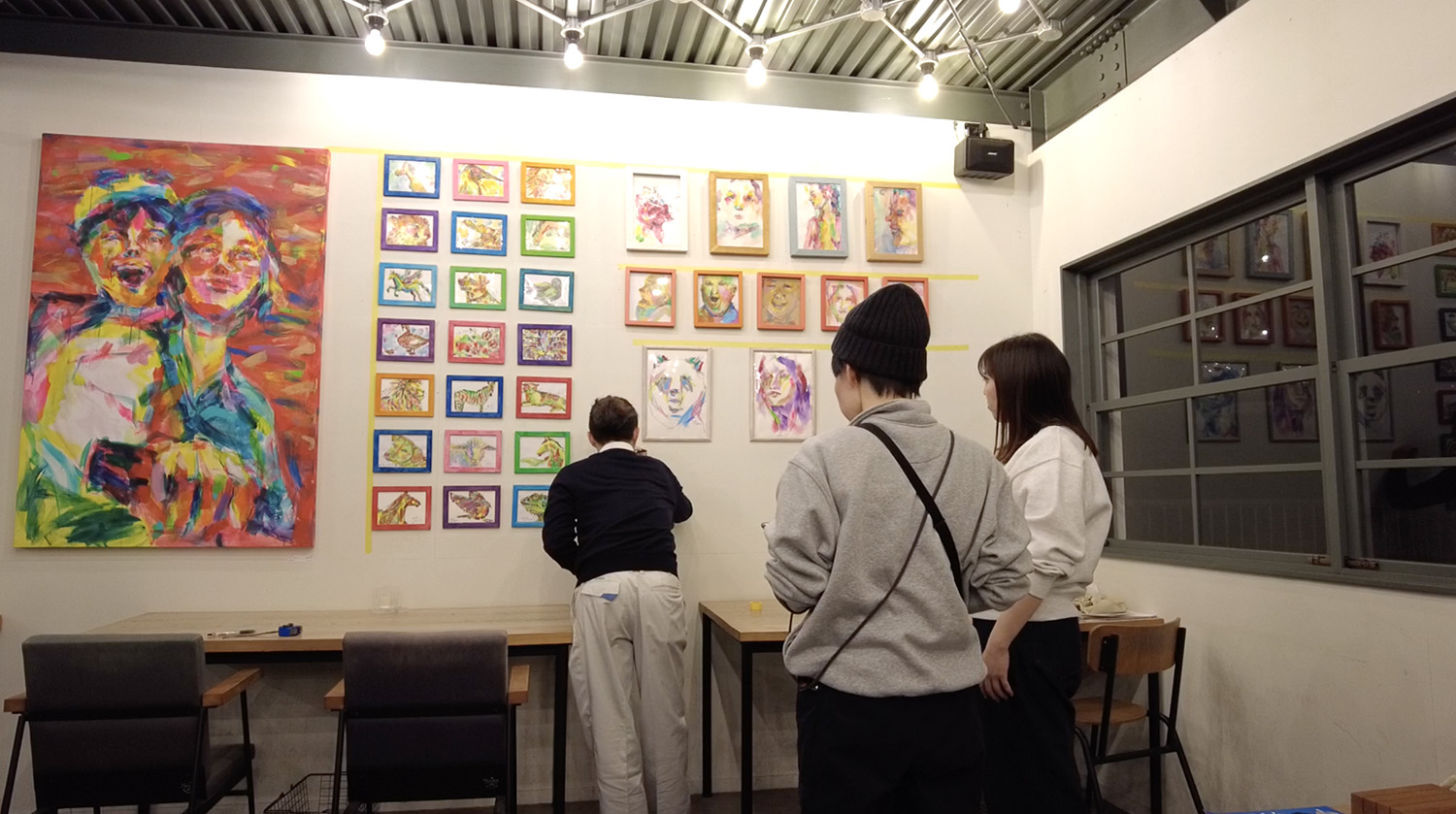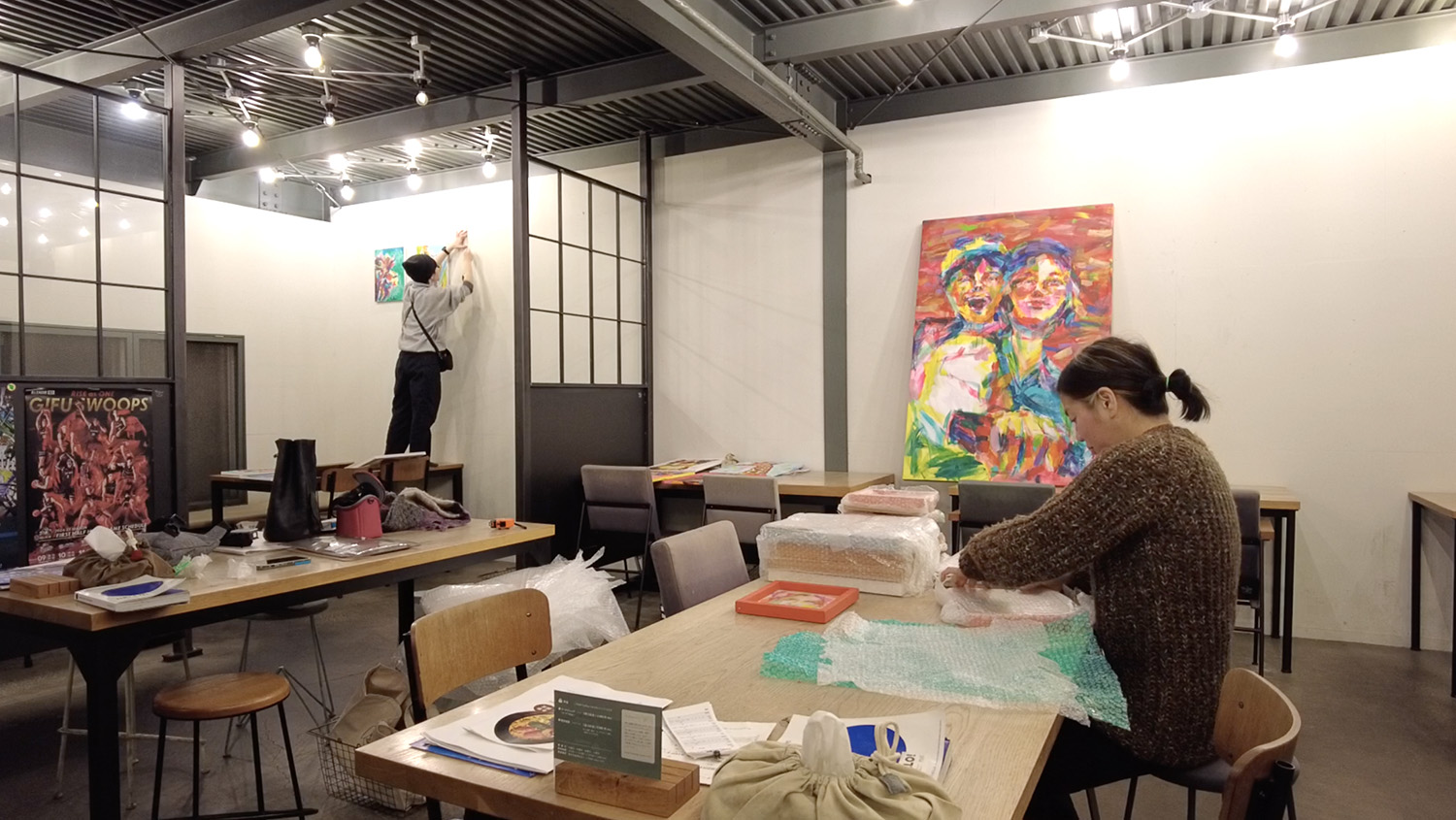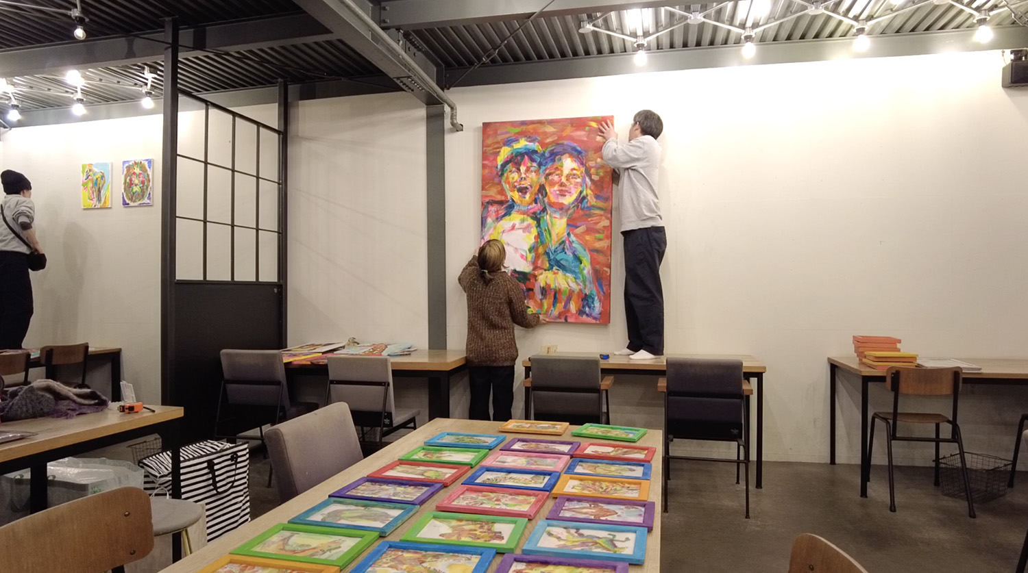 私は絵の梱包を外します。今回は家に眠っていた、2010年あたりに描いた絵たちも飾っていきまーす♪