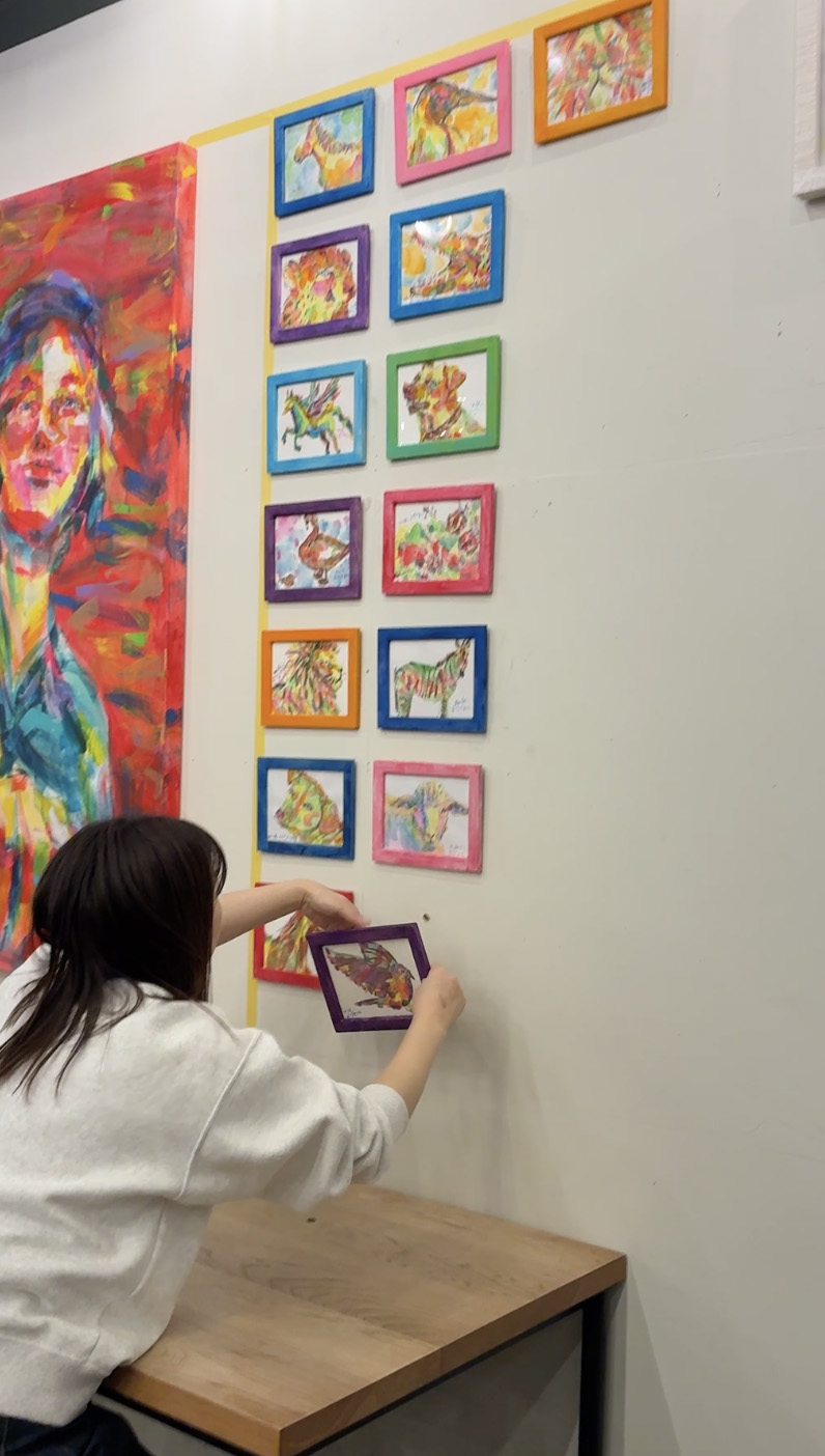 カラフルな額の絵たちのレイアウトも考える。