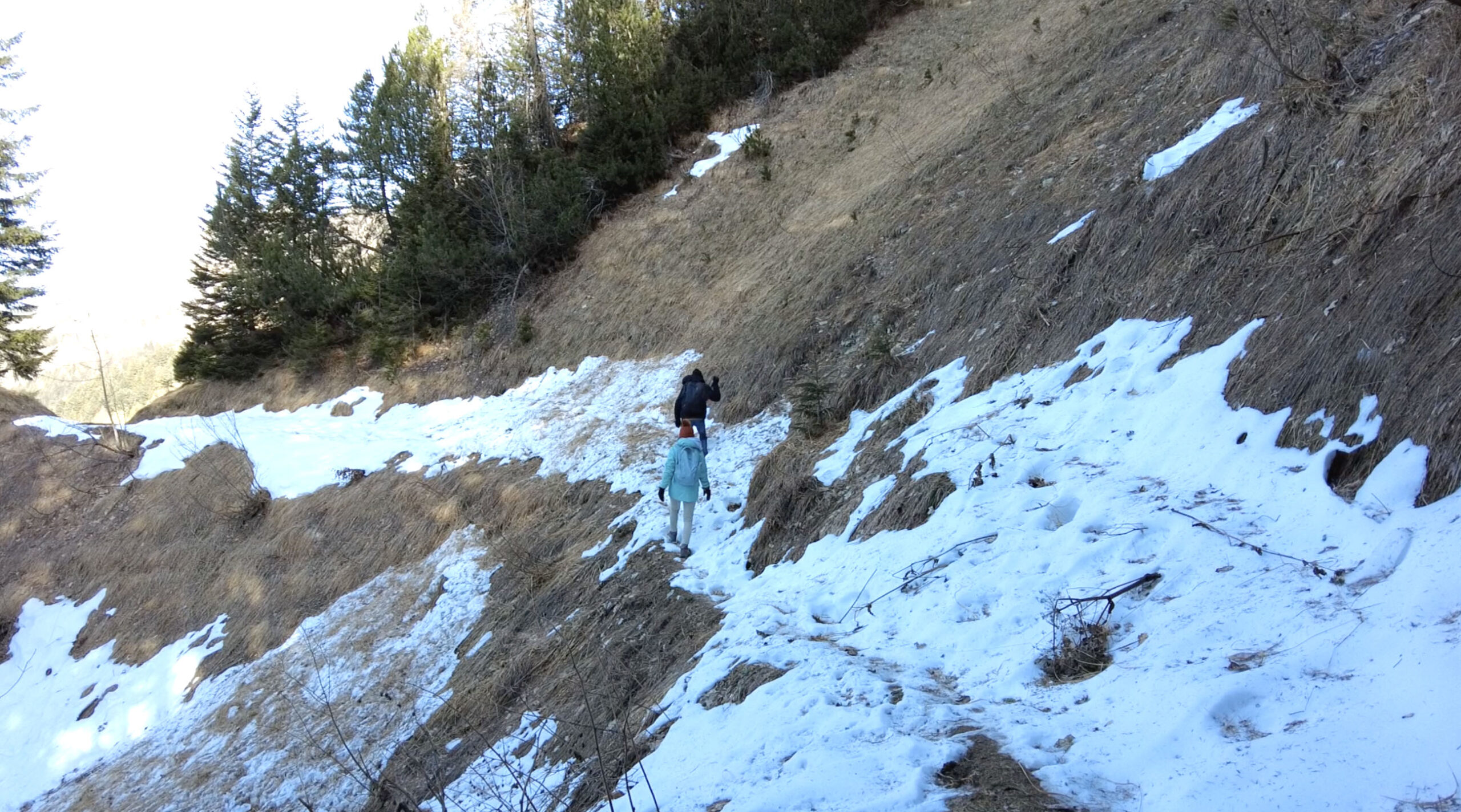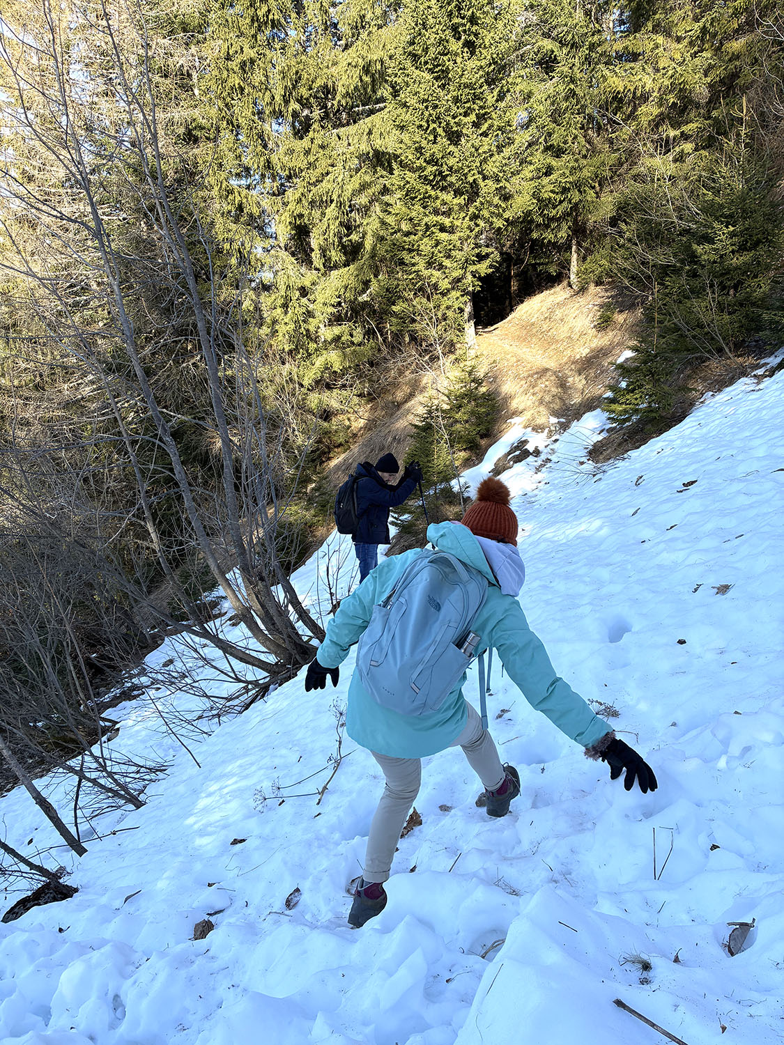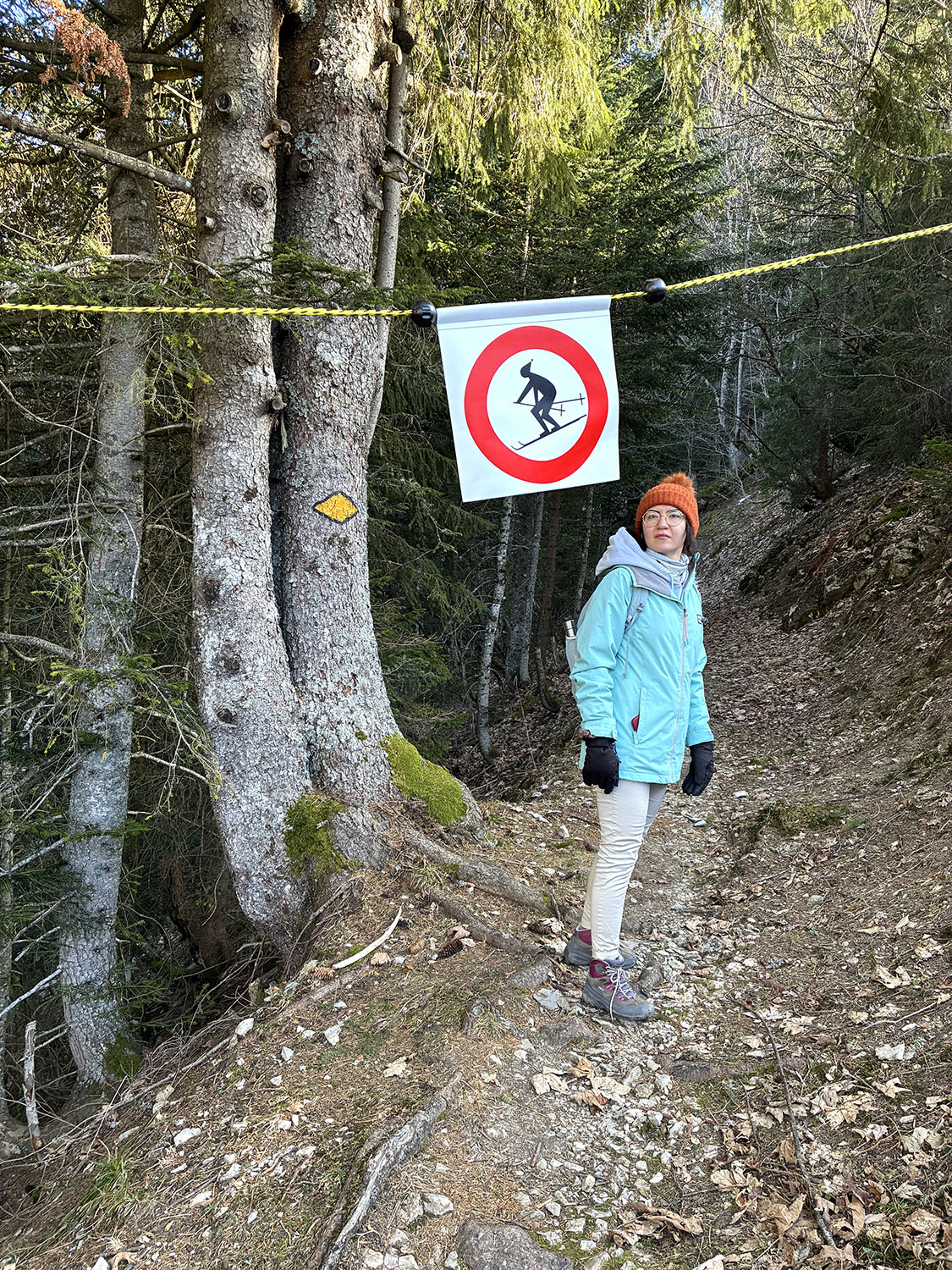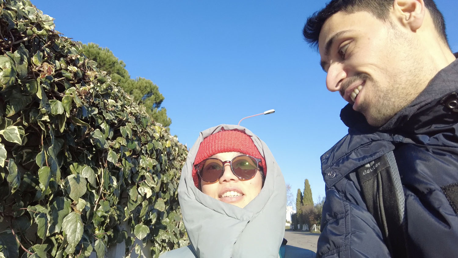 陽射しはあるけど、寒いから、ニットキャップとサングラスと、コートのフードをかぶる、このスタイルで歩きます。ニットキャップと手袋必須。